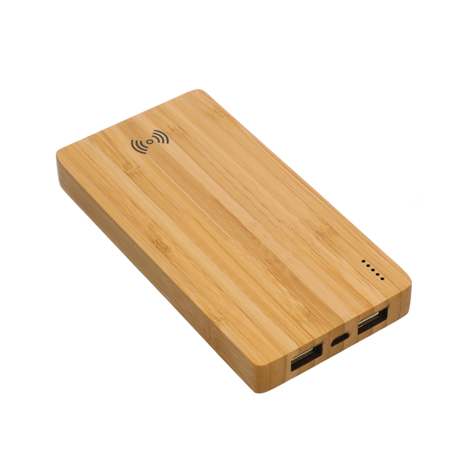 This bamboo power bank contains a rechargeable lithium polymer battery that pulls double-duty as a wireless charging pad or a regular on-the-go power bank.
